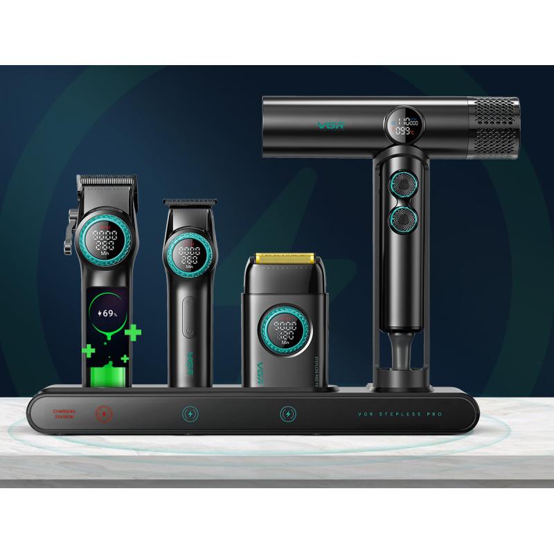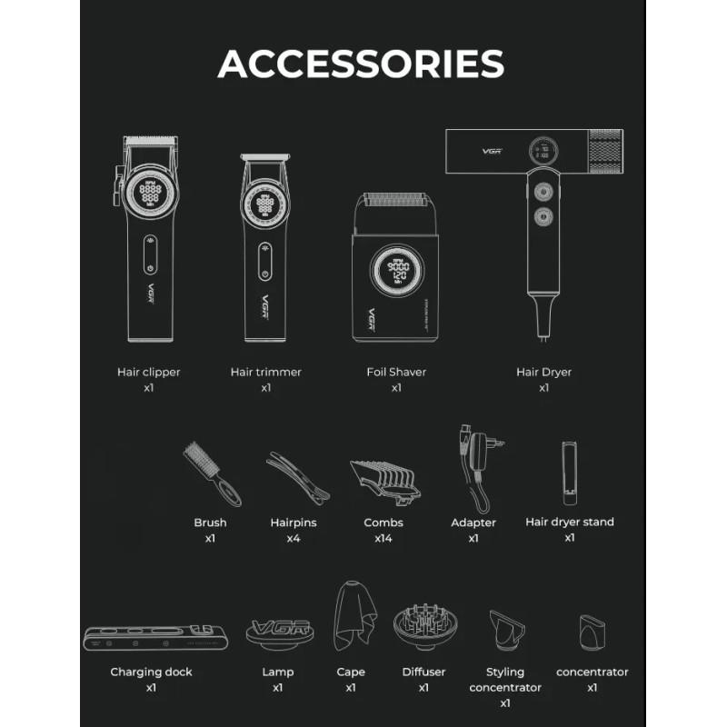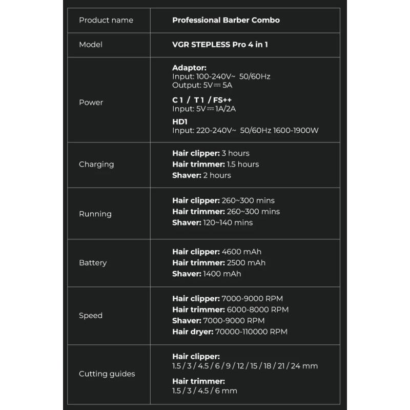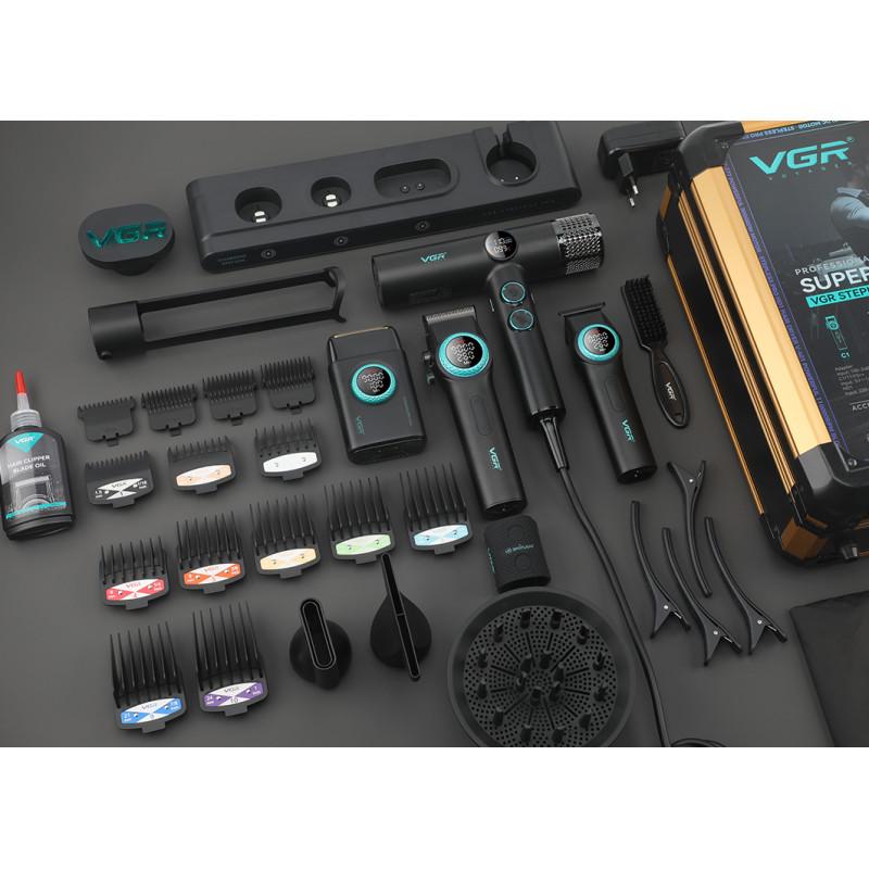 Набор инструмента VGR Stepless 4 in 1 Black - это отличный подарок профессиональному стилисту или барберу, а так же он может стать отличным подарком всей семье. Потрясающий набор, который состоит из четырех популярнейших и функциональных моделей - фена для волос, машинки для стрижки, триммера и шейвера. Такое решение не оставит равнодушным никого, а богатая комплектация придает особой пикантности, рассматривая его, как возможный вариант для себя. Все модели из набора есть в нашем каталоге, коротко пройдемся по каждой из них. При необходимости нажимайте на ссылку и полностью ознакамливайтесь с конкретной моделью из набора.