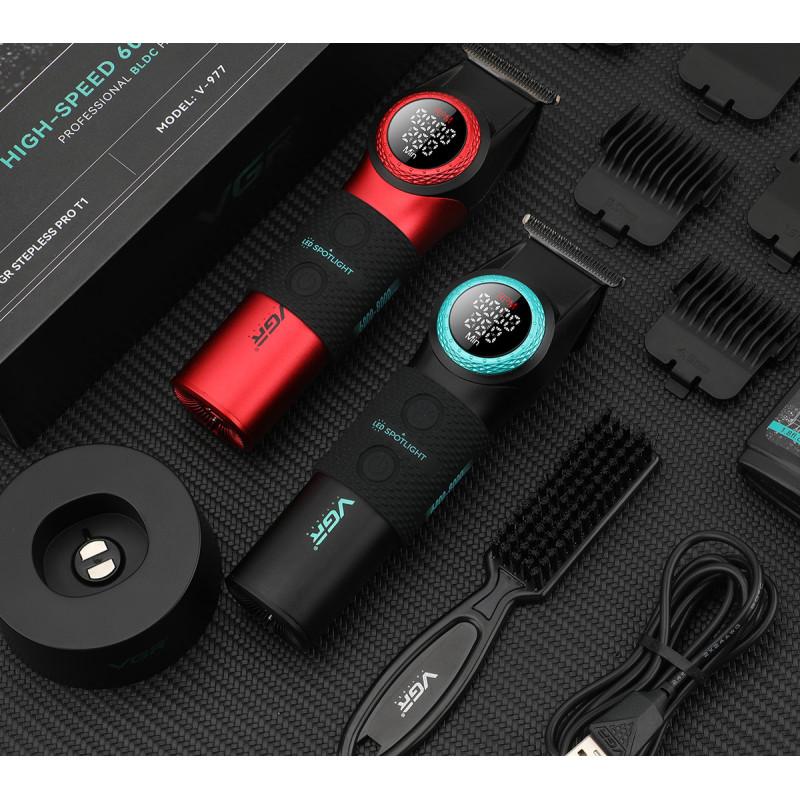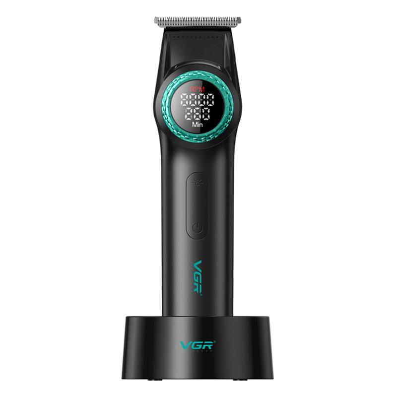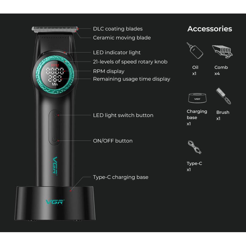 Модель VGR V-977 оснащена мощным роторным мотором с высокой частотой работы - 8000 оборотов за минуту. Напомним, что за один оборото эксцентрик заставляет нож двигаться дважды. Таким образом ножевой блок делает 16 000 движений за минуту. Высокая скорость мотора обеспечивает чистый срез при любой интенсивности работы. На корпусе размещен специальный LED дисплей, на котором отображается расчетное время работы от аккумулятора, необходимости смазки ножей, выбранная скорость и индикацию зарядки. Говоря о скорости – в модели их 21, поэтому вы сможете максимально точно подобрать необходимую интенсивность в зависимости от задачи и конкретных волос, чтобы сохранить заряд аккумулятора без необходимости работы на максимальных оборотах.