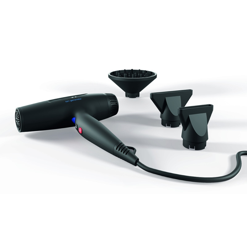 Корпус модели Kiepe 8313 изготовлен из матового пластика и имеет уменьшенный диаметр в сравнении с традиционными моделями. Эргономичная ручка и хорошая балансировка по весу обеспечат комфортную эксплуатацию, особенно, учитывая небольшой вес модели в 440 грамм. Модель имеет 3 режима скорости и 3 режима температуры, включая холодный обдув с отдельной кнопкой, что дает пользователю максимальную гибкость в выборе режима работы – 12 настроек. Элементы управления расположены по центру ручки, что позволит работать моделью одинаково комфортно любой рукой.