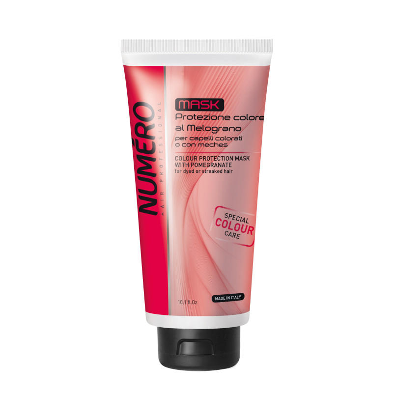 Маска Brelil Numero Colour з екстрактом граната, вітаміном С, вітаміни групи В, високим вмістом антиоксидантних поліфенолів призначений для використання на фарбованому волоссі. Всі ці компоненти забезпечують волоссю надійний захист кольору. Шампунь захищає волосся від вигорання і впливу зовнішніх негативних чинників, надовго зберігає інтенсивність і яскравість кольору. Маска не обтяжує волосся.