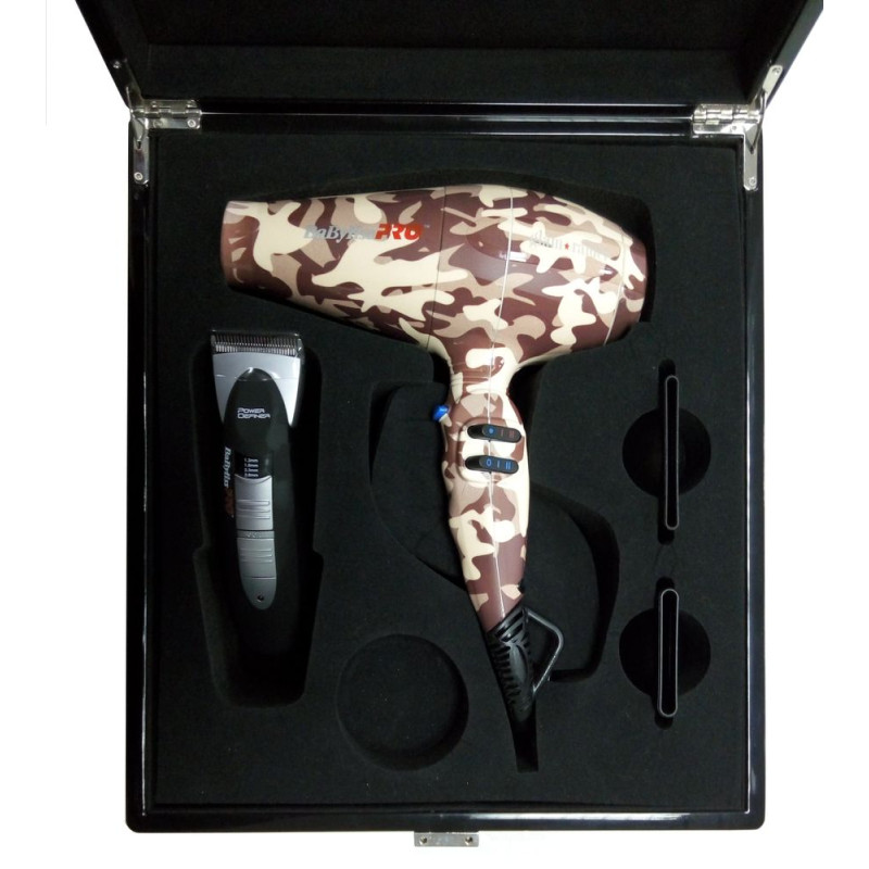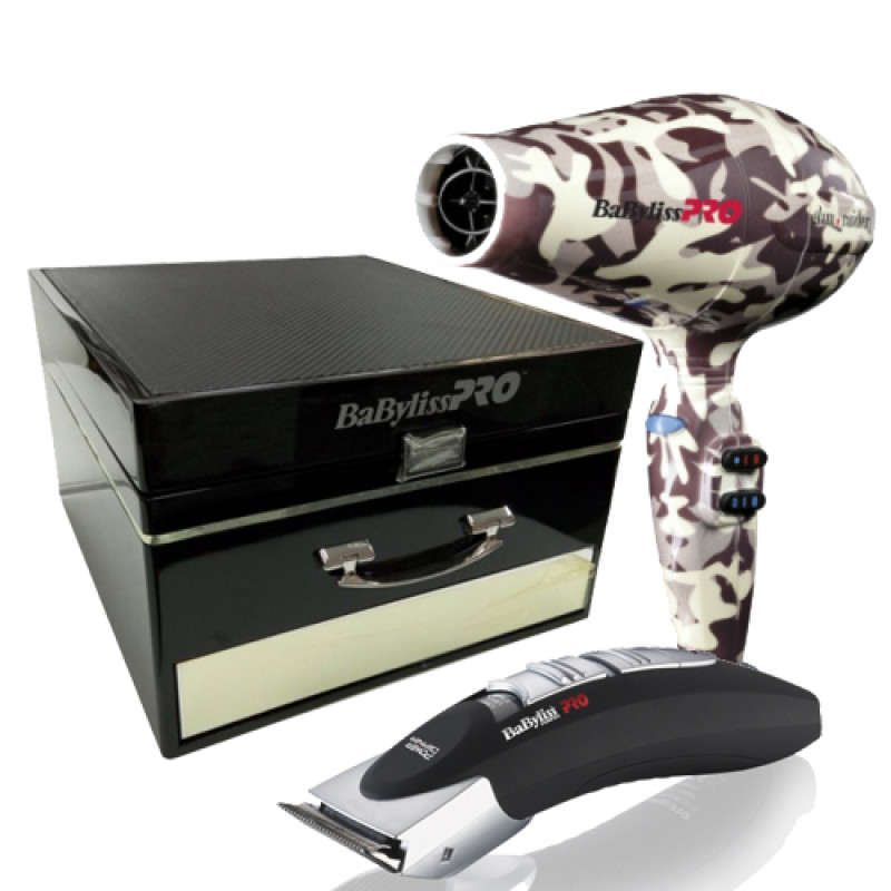 Набір професійних інструментів від BaByliss PRO. До складу набору входить професійний фен для волосся BaByliss PRO GLAM RIDER (BAB6610IARE) і професійна бездротова машинка для стрижки BaByliss PRO FX672E