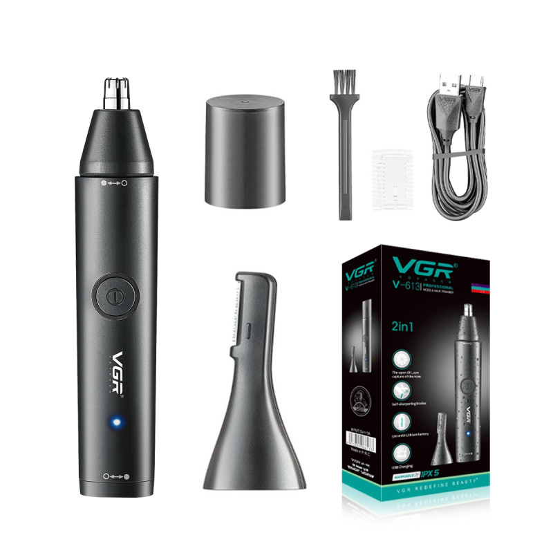 VGR V-613 – чудовий бездротовий триммер для носа 2в1. Компактна модель з хорошими можливостями і відмінною комплектацією, яка включає насадку для видалення волосся в носі і вухах, а також насадку-триммер для виконання окантовки і стрижки вусів. Такий аксесуар ніколи не буде зайвим, як вдома, так і в різних подорожах або відрядженнях.