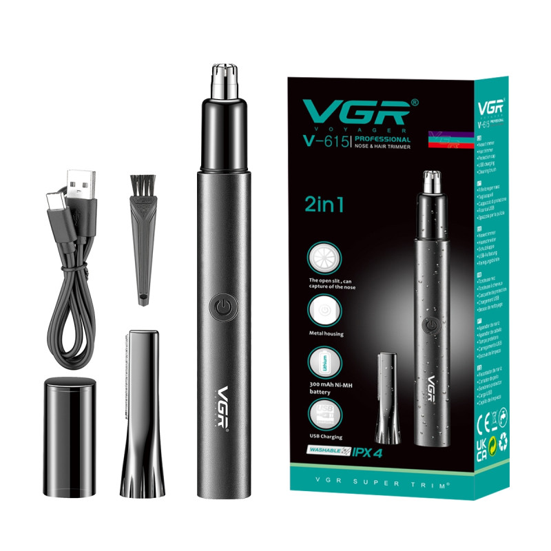 VGR V-615 – чудовий бездротовий триммер для носа 2в1. Компактна модель з хорошими можливостями і відмінною комплектацією, яка включає насадку для видалення волосся в носі і вухах, а також насадку-триммер для виконання окантовки і стрижки вусів. Такий аксесуар ніколи не буде зайвим, як вдома, так і в різних подорожах або відрядженнях. Корпус моделі вологозахищений, клас захисту IPX4, що благає його промивати під водою не боячись за працездатність.