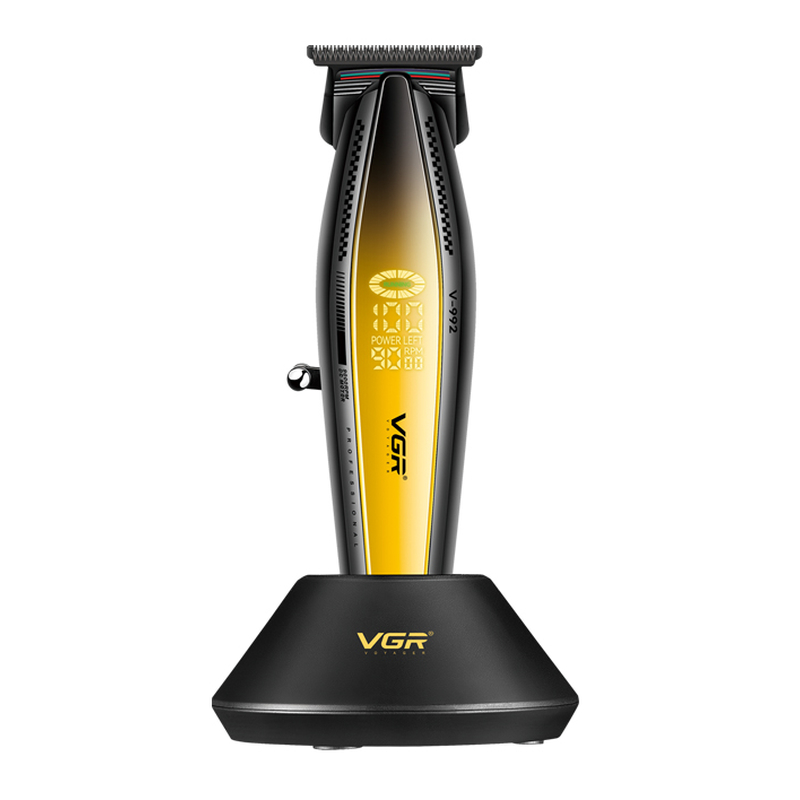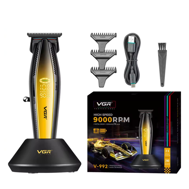 Модель VGR V-992 оснащена потужним роторним двигуном з високою частотою роботи. Тример оснащений системою контролю частоти роботи мотора, щоб забезпечити постійну потужність на максимальній швидкості в режимі 9000 оборотів за хвилину. Висока швидкість двигуна забезпечує чистий зріз при будь-якій інтенсивності роботи незалежно від густоти та жорсткості волосся. На корпусі розміщено спеціальний LED дисплей, на якому відображається розрахунковий час роботи від акумулятора та поточна швидкість двигуна.