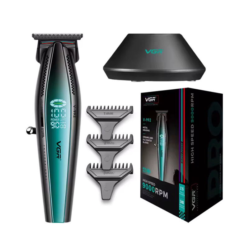 Модель VGR V-992 оснащена потужним роторним двигуном з високою частотою роботи. Тример оснащений системою контролю частоти роботи мотора, щоб забезпечити постійну потужність на максимальній швидкості в режимі 9000 оборотів за хвилину. Висока швидкість двигуна забезпечує чистий зріз при будь-якій інтенсивності роботи незалежно від густоти та жорсткості волосся. На корпусі розміщено спеціальний LED дисплей, на якому відображається розрахунковий час роботи від акумулятора та поточна швидкість двигуна.